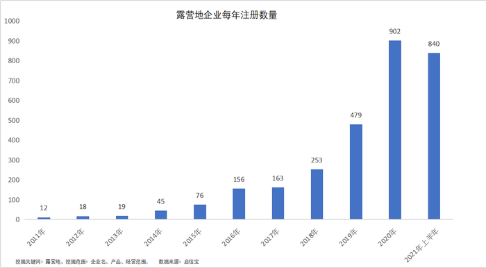 2020年是相关企业注册量的爆发期,企业名、产品、经营范围中含“露营地”的企业有902家,同比增长88%。