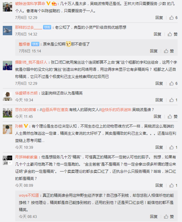 还有网友表示,打着精英的旗号,干着资本家的生意。能让他挣到钱的是有用的人,不是他的客户就是无用的人。做生意就做生意,知识付费就知识付费。但这样明目张胆大张旗鼓地否定大部分人,真是丑态毕露,恶心。依我看,吴晓波这类人其实就是精致的利己主义者,彻头彻尾的伪精英。