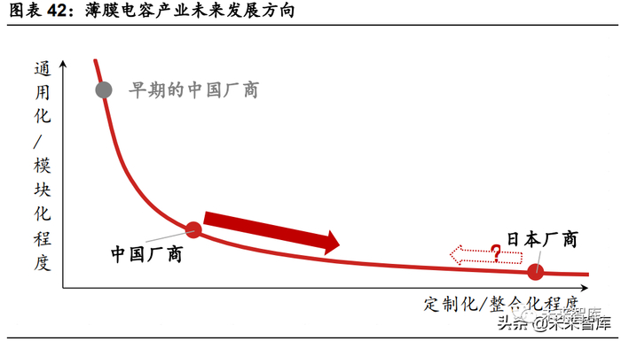 为了更好满足个体客户的需求,我们认为薄膜电容企业目前已经完成了内 部的模块化,并实现了交付产品的高度整合化。通用化产品常常因为其通用性 而具有较高的模块化程度、但整合化程度较低。另一方面,在混合动力车应用 领域,企业内模块化程度低于通用化产品(为满足客户需求),但对外整合化程 度则较高。因此,如果企业能提高内部模块化程度及对外整合化程度,或将有 助于实现产品降价及性能提高,提高产品竞争力。相对的,对外整合化较低的 产品或面临较激烈的价格竞争。