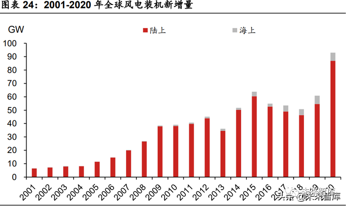 根据 GWEC 预测,全球风电装机量在 2021-2025 年将呈先降后升的态 势,2021-2025 装机量 CAGR 约 4%,至 2025 年约为 112GW,其增长态势将 主要取决于政策导向。2021 年全球装机量下滑主要由于中国地区风电将进入后 补贴阶段,而 2019 年批准的项目(仍带有补贴)在 2020 年也基本完成建设, 此后中国装机量将快速回升。同时,随着海上风电逐步实现商业化,GWEC 预 计至 2025 年海上装机量将达 23.9GW,较 2020 年的 6.1GW 提升近 300%。