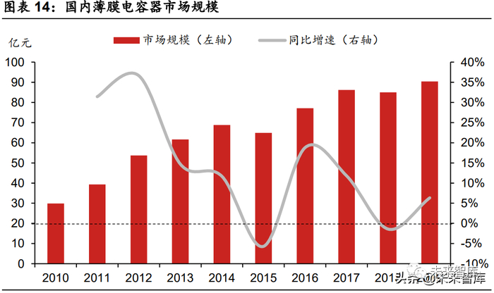 薄膜电容产业链上下游较为稳定。产业链上游主要是原材料,包括导线、 金属箔、基膜、外包装树脂等材料。其中,基膜是薄膜电容的电介质,电介质 材料不同,薄膜电容的性能也有所不同,所以基膜是最重要的上游原料,占材 料成本的 60%-70%。产业链下游主要包括家电、LED 照明、轨道交通等传统行 业,以及新能源汽车、光伏风电等新兴行业。受益于下游传统行业的稳定发展 以及新兴行业的快速成长,薄膜电容市场规模稳步扩大。