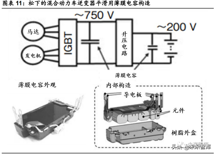 由于薄膜电容的低损失、高耐电压、波纹电流高兼容性等优异的电气特 性,首先考虑到的用途是马达驱动用逆变器平滑用。2003 年 9 月发售的第二代丰田普锐斯率先使用日本松下的薄膜电容来替代平滑用电容。初次使用的松下 薄膜电容综合了逆变器平滑用途及缓冲用途,额定电压 600V,超 大容量 1180uF。为了实现逆变器的高效率化,不断推进系统电压的高电压化及 逆变器本身的小型化,薄膜电容的小型高耐压要求也不断提高。随着混合动力 车市场的扩大,松下逐渐成为了车载薄膜电容领域的龙头厂商。