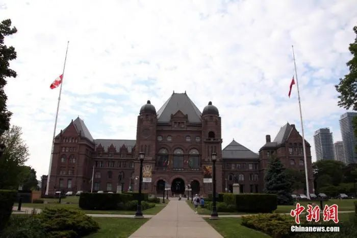 当地时间6月2日,在位于多伦多的加拿大安大略省省议会大楼门前,人们摆放了各式玩偶、 上百双童鞋和鲜花、留言卡等,为日前该国卑诗省(又译不列颠哥伦比亚省)一处原住民寄宿学校旧址发现215具儿童遗骸之事志哀。中新社记者 余瑞冬 摄