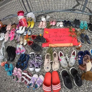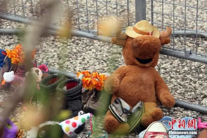 当地时间6月2日,在位于多伦多的加拿大安大略省省议会大楼门前,人们摆放了上百双童鞋和各式玩偶、鲜花、留言卡等,为该国一处原住民寄宿学校旧址发现215具儿童遗骸之事志哀。中新社记者 余瑞冬 摄