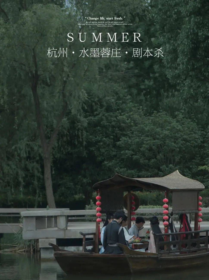 坐落于超山景区(杭州市临平区4A级景点)脚下的杭州水墨蓉庄艺术主题酒店,为玩家提供着“坐游船,赏湖景,品茶歇”的新晋画舫剧本杀体验,非常适合上班族于周末前往,在依山傍水的环境下获得极致的放松。