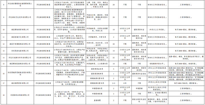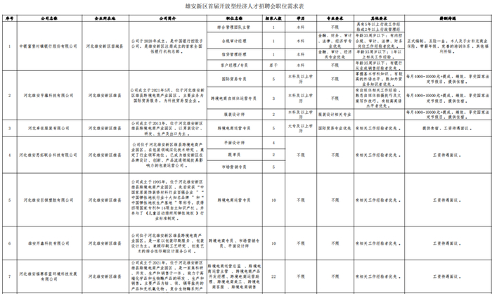 具体招聘企业及岗位需求、薪酬待遇等信息详见附件(雄安新区首届开放型经济人才招聘会职位需求表)。