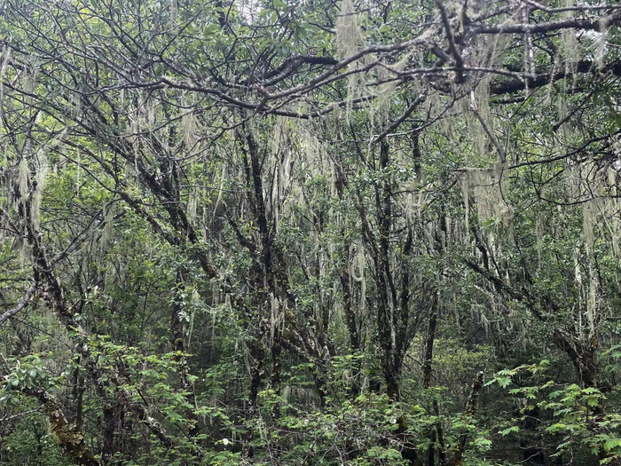 在云南,这种长松萝是滇金丝猴最喜欢的食物,与生长在香格里拉雪山上的雪茶是同一家族,其地衣结构非常独特,是菌类和藻类的共生体,如果把菌藻分开,植物就会死亡。长松萝是天然的空气监测器,只有在空气纯净的地方才能生长。所以,看到成规模的长松萝出现,绝对是最纯净的天然氧吧供给,怎不令人欣喜?