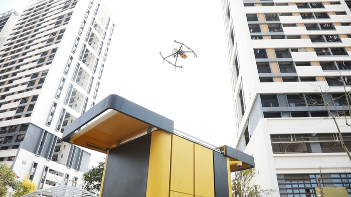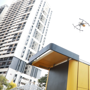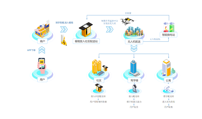 首先,要人工把餐放在无人机的“肚子”里,无人机能带得动普通人的饭量。无人机起飞,在空中得有信号不掉线,实时与云端智能调度系统连接,确保无人机之间不会互相干扰,更不会撞上电线杆和高楼;最后到达目的地,要找准降落地,比如一个超小型机场,将餐放下来。