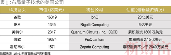 整体来看,美国以80家量子技术公司的规模遥遥领先,其中,除了IBM、谷歌等巨头,还包括一批在量子计算、量子通信等各细分领域耕耘的初创公司:包括专注于超冷原子量子技术的ColdQuanta、专注于离子阱量子技术的IonQ、专注于光量子技术的PsiQuantum、专注于研发量子计算机软硬件的Rigetti Computing,以及基于超导技术研发全栈量子计算的Quantum Circuits(QCI)。在量子应用方面,有为量子计算机提供企业应用的QC Ware公司,有专注于分子模拟的云量子工具的Qsimulate,还有为商业开发量子软件和算法的Zapata Computing(表1)。