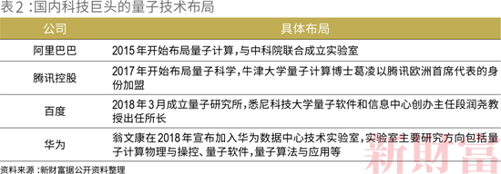中国有13家公司介入量子技术领域,阿里巴巴(09988.HK)、百度(BIDU.O)、腾讯控股(00700.HK)、华为以及台积电(TSM.NYSE)等巨头悉数入场,于2015年开始成立研究所、实验室(表2)。目前,百度、华为、阿里巴巴均已推出各自的量子计算云平台,分别是量易伏、HiQ、阿里云量子开发平台(AC-QDP)。