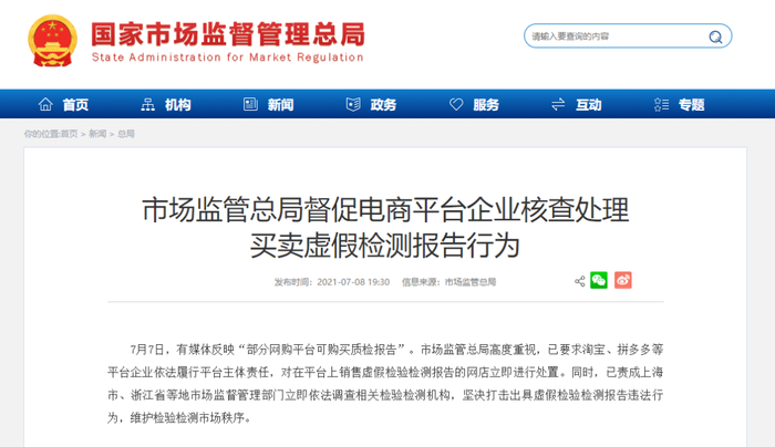 7月8日,国家市场监管总局网站显示,7月7日,有媒体反映“部分网购平台可购买质检报告”。