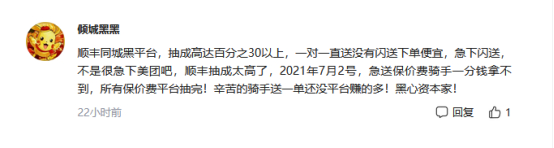 再看骑手端,首财关注到,在顺丰同城冲击上市的相关新闻评论区,有疑似骑手身份的用户做出以下发言:
