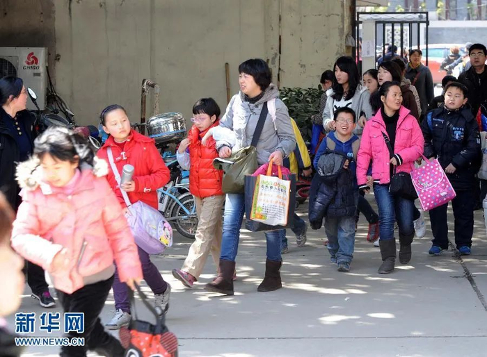南京一处课外辅导班门前,家长送孩子前来上课。(新华社记者孙参摄)