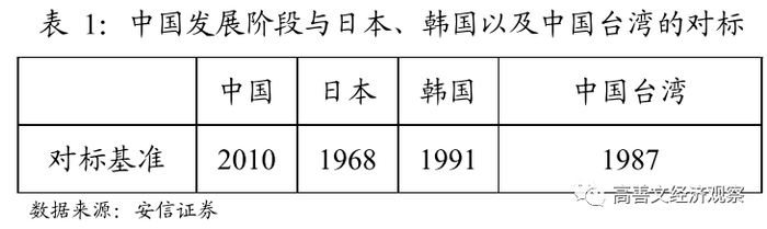 因此,我们通过人均GDP、第二产业相对第三产业占比等指标,对东亚经济体进行经济结构参数的历史比对,得出的基本结论是:中国2010年的经济发展程度、人均收入和生活水平大致接近于日本1968年前后的水平、韩国1991年前后的水平、中国台湾1987年前后的水平。