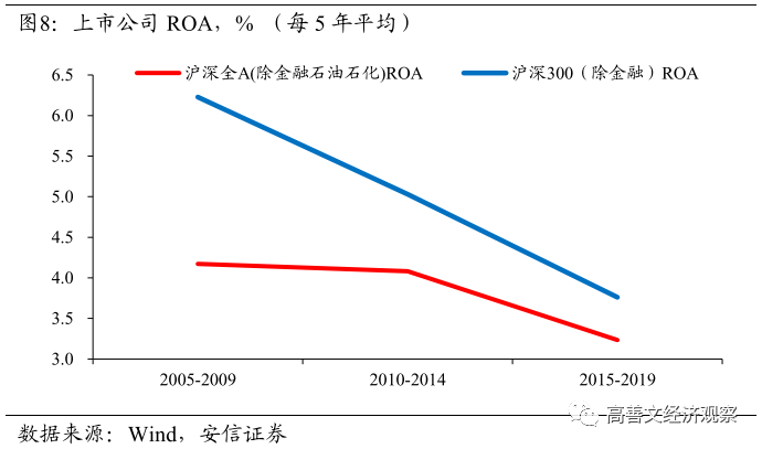 针对上述数据,我们可以做一个基本的结论,即:全社会总量层面上的ICOR和资本报酬率不断下降的趋势,在以ROA所代表的多数微观领域上也有十分一致的体现。