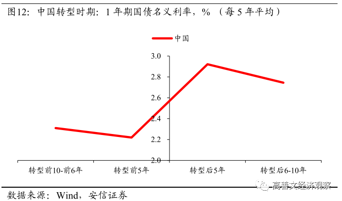 然而,当我们去观察转型时期中国的情况时,如图12所示,结果非常令人惊讶——中国一年期国债的名义利率在过去15年里经历了非常明显的上升,其在转型原点前五年的时候还在2.2%左右,在转型后的五年和十年里都上升到了2.8%、甚至更高一些的水平。这一上升与总资产报酬率的趋势不一样,也与东亚其他经济体的走势不同。