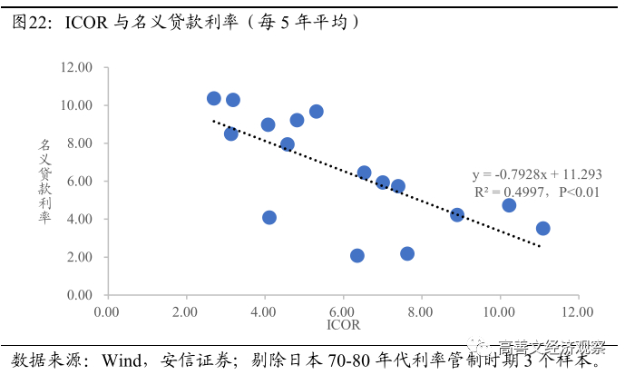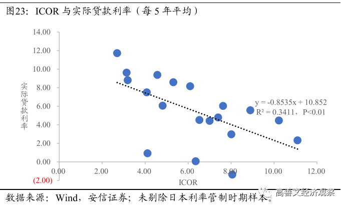 另外,如果我们不去考虑国家之间的差异所可能造成的影响,把日本、韩国以及中国台湾的样本做成一个混合数据,简单地观察ICOR在长期之内与国债利率、贷款利率之间的关系。