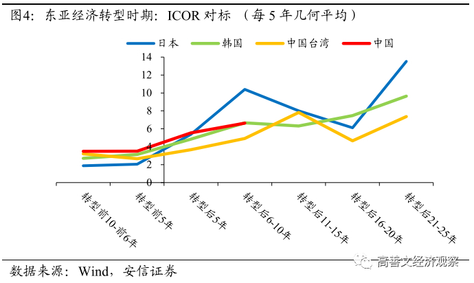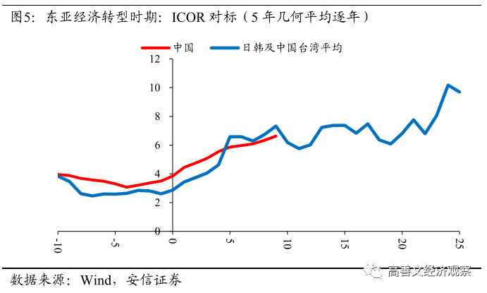 按照前述相同的方法,我们把中国放在东亚经济体转型的背景下,与日本、韩国、中国台湾的情况进行对标。如图4所示,在经济转型之前,中国的ICOR与他们相比是非常接近的,基本都稳定在3-4左右的水平;而在转型以后,东亚经济体ICOR都经历了长期、趋势性的上升,这意味着东亚经济体的资本边际报酬率也都经历了不断的恶化。