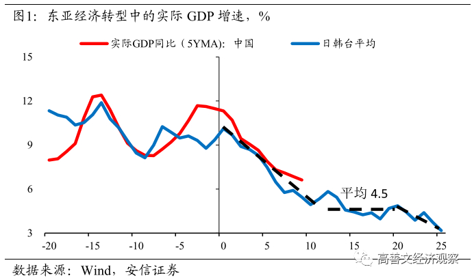 尽管在过去经济增速波动下行的过程中,我们也经历过慌乱和担忧,但是现在回头来看,经济增速的下降也没有那么可怕。而且,相较于周边东亚经济体所经历的经济增速下行和转折过程,中国的数据在主要趋势上的表现类似,包括经济增速中枢下降后所达到的水平、以及下降的斜率,放在国际比较的背景下来看都是比较正常的。