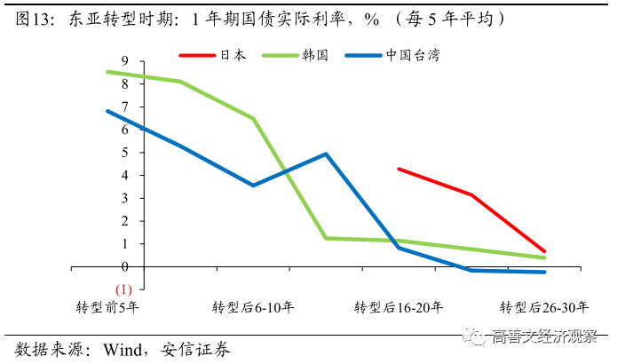 首先,考虑到国债利率的代表性,我们以一年期国债名义利率为样本,按照前述同样的对标方法来研究东亚经济体转型时期的利率表现。如图11所示,在经济转型以后较长的时期里,随着资本边际报酬的下降,日韩以及中国台湾的1年期名义国债利率均出现了非常明确的、十分一致的下降趋势。