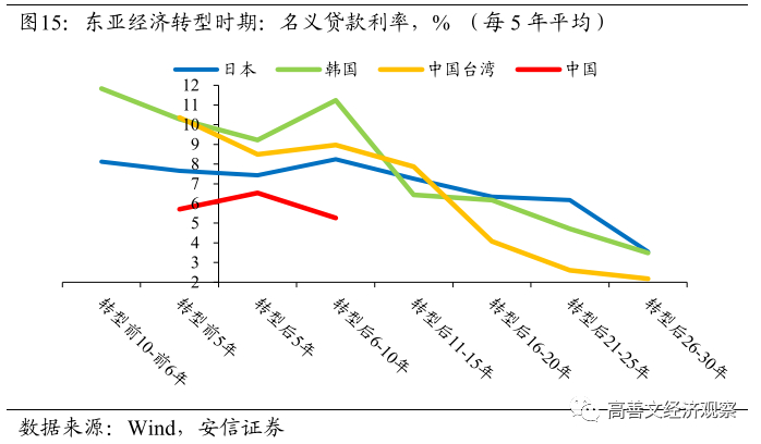 所以,我们选择了另外一个角度,就是去观察东亚经济体信贷市场的利率。如图15所示,结果一目了然,即在东亚经济转型背景下,日韩以及中国台湾的信贷利率长期下降趋势是清晰而显著的。