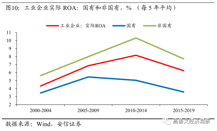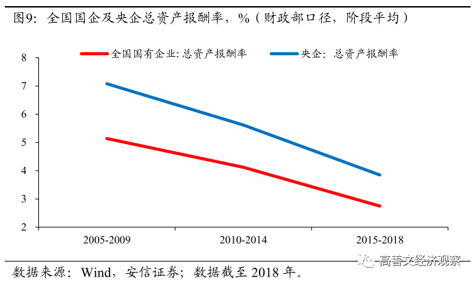 因此,为了观察这种微观层面的变化,且考虑到个体样本代表性,我们选择的研究对象包括上市公司的总资产回报率,国企与央企的总资产报酬率,以及包括国企和非国企在内的工业企业总资产回报率。