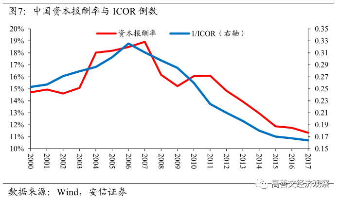 其含义是,经济活动每增加一块钱的产出,需要额外付出多少资本。该指标越高,就意味着每增加一块钱的产出所需要投入的资本越多。因此,资本边际报酬递减的过程在该指标上就反映为ICOR的数值不断上升。