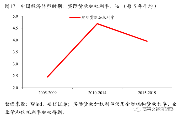 如图17所示,尽管其在转型后的5-10年(2015-2019 年)经历了下降,但是相比转型前的利率水平仍然要高。而同时期宏观层面的资本报酬率、以及微观层面的企业资本回报率,却比相应时段要低得多,即表现为:中国贷款利率的水平并没有随着资本边际回报的递减而下降,反而出现了中枢大幅抬升的现象。