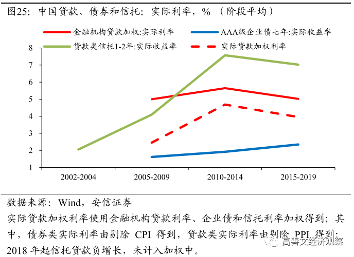 如图24-25所示,在这些子门类的数据里,基本上看不到利率下降的趋势,或者说利率中枢存在或多或少的上升。即使剔除了通胀影响,其实际利率水平也呈现出近似表现。