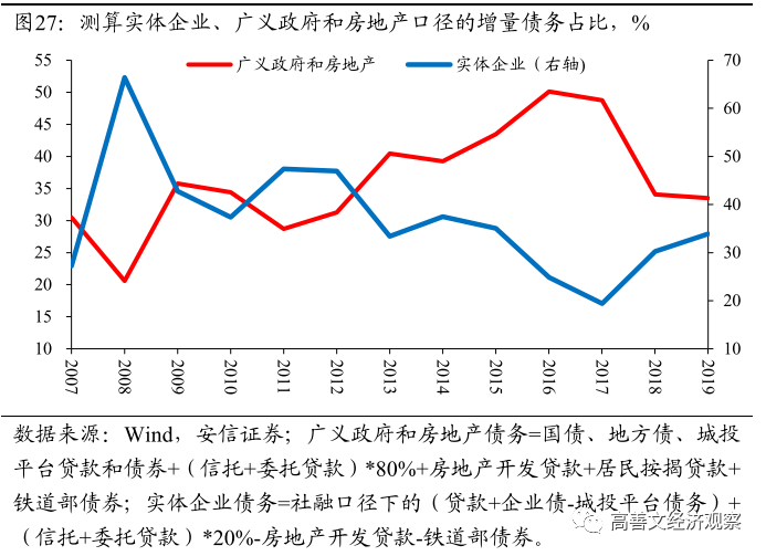 从数据表现来看,如图27所示,在2010-2017年期间,广义的政府和房地产领域融资在每年的社会融资增量中的占比出现快速上升。2010年的占比水平可能不到30%,到2017年很可能超过了50%;与此同时,整个实体企业的融资占比大幅下降。