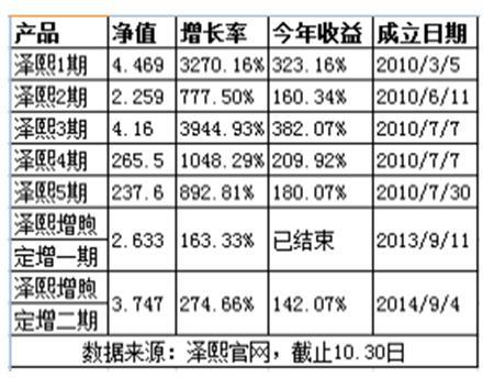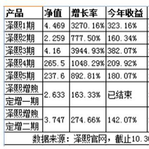 在股市连续疯狂下挫的2015年,该公司管理的6只产品,截至今年10月30日,这些产品均表现得极其出色,其中,泽熙1期为323.16%;泽熙2期为160.34%;泽熙3期为382.07%;泽熙4期为209.92%;泽熙5期为180.07%;泽熙增煦定增二期为142.07%,远远跑赢当年的沪深大盘。而其中的泽熙3期收益在短短五年时间内,收益增长率达到3944.93%,将近40倍。让所有投资者瞠目结舌,让人难以置信。一时间徐翔概念股鸡犬升天,只要能和徐翔沾上边的股票个个表现不俗。徐翔也正式成为上海滩资本市场的“扛把子”。