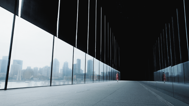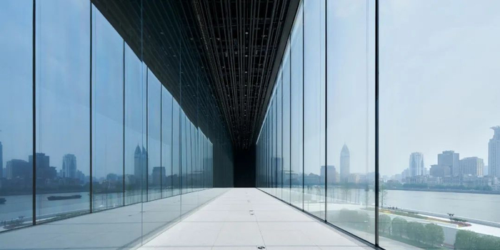 这面大玻璃墙,宽55米、高18米(跨越两层,分别为12米和6米)。站在美术馆门外抬头看,天空、白云、江面与游船映在玻璃上,随着光线的变化,玻璃倒映的景象就像一幅“流动”的画。