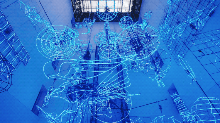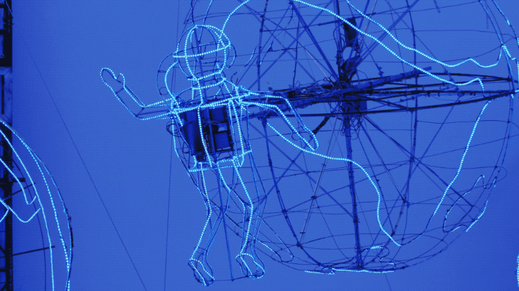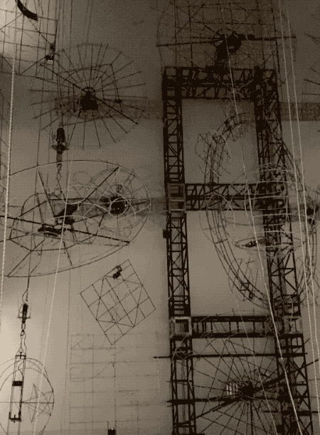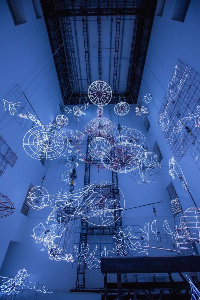 这种装置的形式来源于墨西哥烟花塔,各种木架、绳索交错,数十座马达控制的旋转装置“噌噌”地工作。布展难度很大,疲惫的时候,蔡国强曾在空间的升降台上躺了下来,就好像“自己一路乘着故乡的风筝,驾游人类童年的宇宙船,浪漫天涯。”