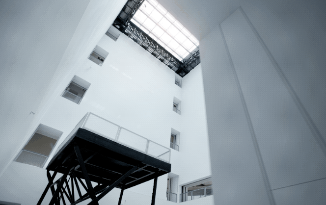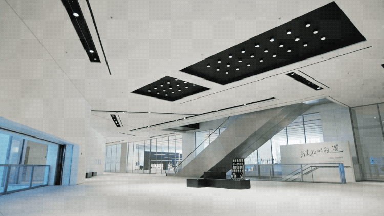 不妨先抬起头看看天花板,你会发现照明灯排列出非常特别的几何阵列。这是建筑师努维尔从“至上主义”代表画家马列维奇身上学到的,通过点、线、面的排布,达到一种抽象的美感。