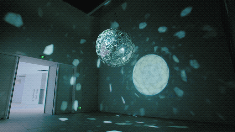 埃利亚松(Olafur Eliasson)的《星尘微粒》高悬在展厅中央,两个不规则的多面体,一个嵌入另一个之中,根据照明条件和观众的位置,作品的外观会发生变化,每个人也成了作品的一部分。