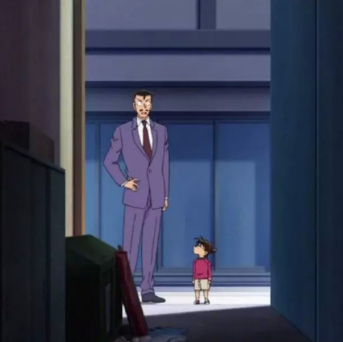 这张图中的场景,发生在主角柯南和毛利小五郎一起前往相关人员处调查案件的过程中。而看截图不难发现,站在小五郎脚边的柯南,身高大概只到其小腿位置。