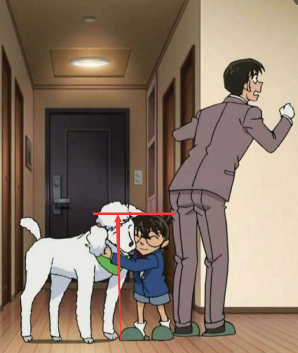 以这个数据反推柯南,其身高可能在70到90cm左右,但是这样以来,以毛利小五郎为首的其他人的身高又变得不合理了。