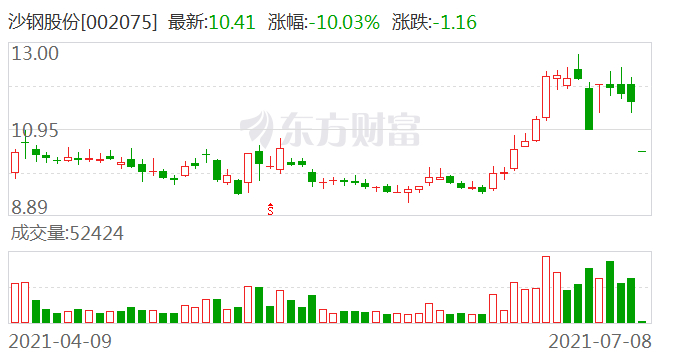 受上述消息影响,7月8日刚复牌的沙钢股份开盘即跌停,股价报收10.41元,盘中跌停板封单超一度319万手,对应封单资金超33亿元,7.5万名股民今夜难眠。