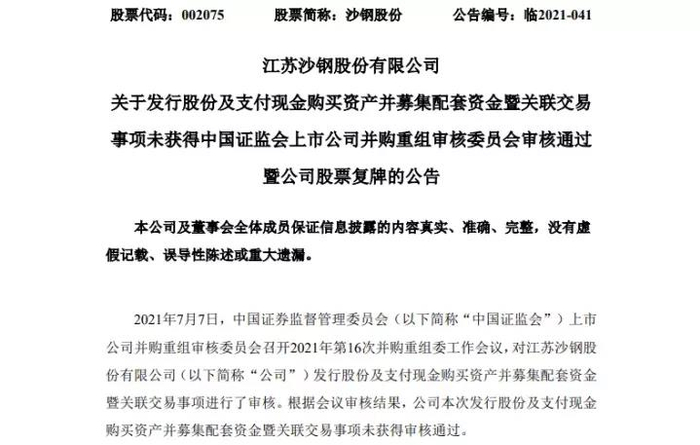 7月7日晚间,沙钢股份发布公告称,证监会并购重组审核委员会当天否决了其重组事项,理由是:盈利能力存在较大不确定性。