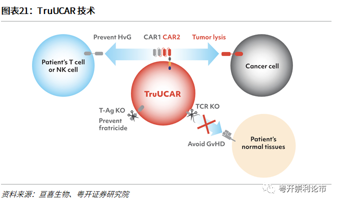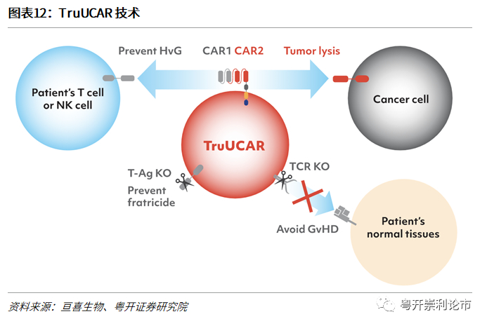 TruUCAR:异体CAR-T细胞产品平台。通过敲除TCR,TruUCAR可诱导患者体内产生长期免疫抑制促使异体通用型CAR-T细胞在体内扩增并杀伤肿瘤细胞,无需使用CD52单抗联合化疗清除人体淋巴细胞避免GvHD,既可避免GvHD,又无需使用CD52单抗和造血干细胞移植(HSCT),GC027是基于TruUCAR平台的候选产品。