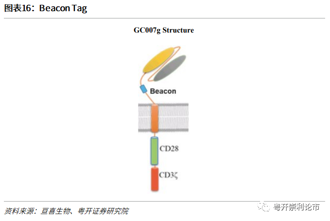 核心技术:GC007g运用了携带Beacon标签的CAR-T细胞改造技术。Beacon标签位于VH和VL之间,或位于VL和跨膜结构域之间,可精确计算体内CAR-T细胞的数量,并在不牺牲疗效的基础上控制CAR-T细胞毒性。