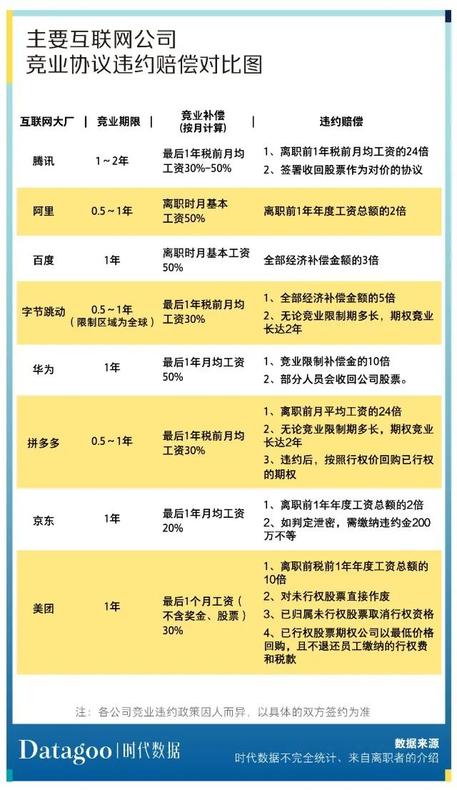 据时代数据不完全统计,头部互联网大厂对离职员工的竞业期限基本定在1年左右,竞业补偿基本为离职前月均工资的30%~50%。至于违约赔偿方面,最狠的要属美团,会要求离职员工赔偿离职前税前1年年度工资总额的10倍;此外,字节跳动、拼多多还有期权竞业2年的特别要求,美团也有类似规定。
