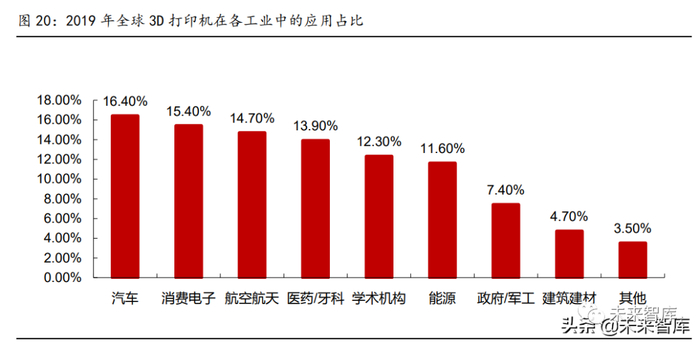 3D 打印材料是 3D 打印技术发展的重要物质基础,材料是 3D 打印发展的重要制约因素。根据 Wohlers Associates Inc 发布的 2019 年 3D 打印下游应用行业统计显示,汽车工业 占比最大,为 16.4%;消费电子以及航空航天以 15.4%和 14.7%占据第二、第三位。根据 下游领域制件品的特性,金属、复合材料需求空间大,有望成为 3D 打印材料的“引爆点”。