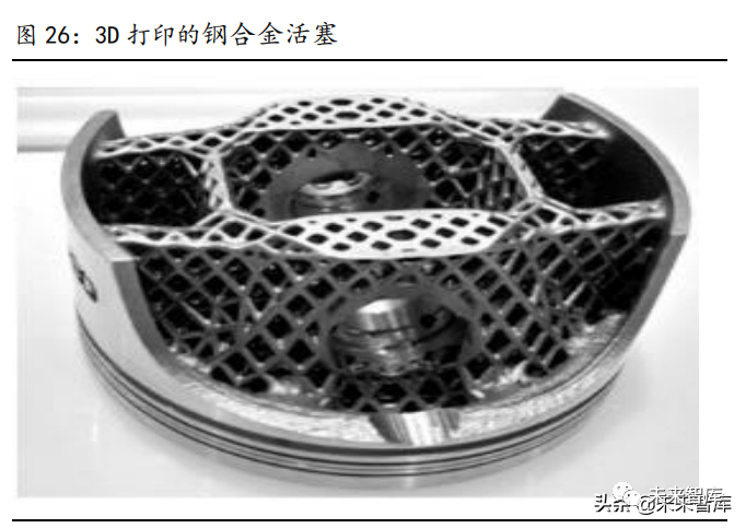 汽车零部件:3D 打印可以制造很多传统工艺无法实现的复杂结构零件,例如点阵结构、 一体化结构、异形拓扑优化结构等,这些复杂结构不仅降低零件的质量,还能发挥其他功 能性的作用。美国加利福尼亚州的 FIT 公司通过选择性激光熔化 3D 打印技术制造充满点 阵结构的仿生发动机气缸盖,该气缸盖质量减少了 66%,表面面积从 823 平方厘米增加 到 6052 平方厘米 ,显著提高了气缸盖的冷却性能,从而改善了赛车的发动机性能。法拉 利 668 赛车应用了 3D 打印的钢合金活塞,该零件内部添加了复杂的点阵结构,不仅可以 减少材料的使用,减轻零件质量,又可以保证高冲击区域的强度,使发动机实现更充分地 燃烧。