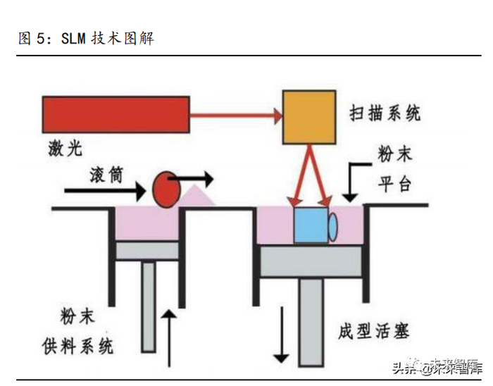 其原理是,激光选择地逐层烧结固体粉末(材料除了主体金属粉末外还需要添加一定比例 的熔点较低的粘结剂粉末,粘结剂粉末一般为熔点较低的金属粉末或是有机树脂等),同 时将烧结成型的粉末叠加至已固化的粉末层上,最终形成所需形状的零件。这种技术依赖 的核心器件是红外激光器,能源工作环境为氩气或氮气气氛。具有制造工艺简单、生产效 率较高、成型材料种类多、材料利用率高、成品用途广泛、无需考虑支撑系统等优势。缺 点是由于粘接剂的作用,实体存在孔隙,力学性能差,需要高温重熔再加工。此外,当产 品存储时间过长时,会因为内应力释放而变形,表面质量一般。运营成本较高,设备费用 较贵。