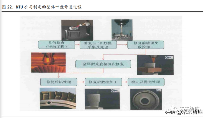 在修复制件方面,利用 3D 打印技术修复的航空发动机整体叶盘的高周疲劳性能优于原始 材料。通过大量基础技术研究工作,国外已经初步建立起整体叶盘的激光修复装备、技术 流程和相应数据库,推动了整体叶盘激光修复技术的工程化应用,我国的相关科研机构也 积极布局 3D 打印激光修复技术。德国弗朗恩霍夫协会与 MTU 公司合作利用激光修复技 术修复钛合金整体叶盘。北京航空制 造工程研究所采用激光修复技术修复了某钛合金整体叶轮的加工超差,并成功通过了试车 考核。