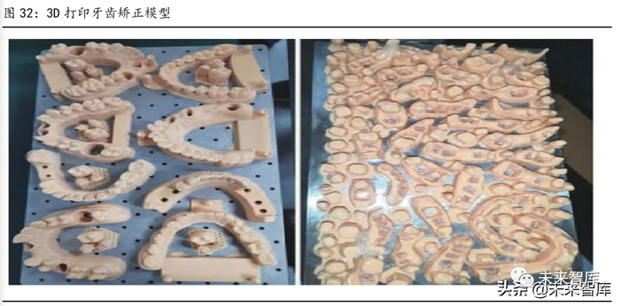 齿科:随着生活水平的提升,大众对于自身外观的重视度不断提升,加之三维影像和光学 扫描仪设备的研发以及 SLA、DLP 技术的成熟,3D 打印在口腔数字化加工、个性化定制、 特别是数字化种植导板,通过口扫、设计、3D 打印,来实现真正的精准种植和精准医疗, 减少了患者的等待时间,提高了患者的舒适度,降低了手术风险,给患者带去更快捷安全 的体验。3D 打印目前主要用于口腔正畸、口腔修复、口腔种植。