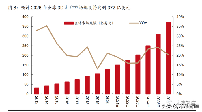 3.1、全球3D打印年均增幅20%,预计2026年规模突破370亿美元