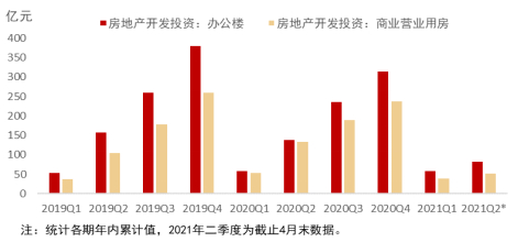 图:2019年至2021年二季度北京房地产开发投资额(办公楼及商业营业用房)