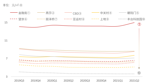 图:2019年三季度-2021年二季度北京重点板块甲乙级写字楼租金走势